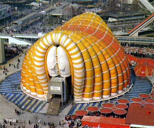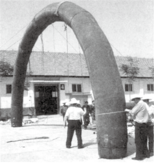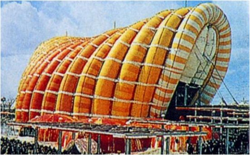 富士館采用氣肋式膜結(jié)構(gòu),結(jié)構(gòu)跨度50m。該館由16根直徑4m、長(zhǎng)78m的拱形氣肋圍成,氣肋間每隔4m用寬500mm的水平系帶把他們環(huán)箍在一起。呈半圓拱形,最高點(diǎn)向外突出7m。