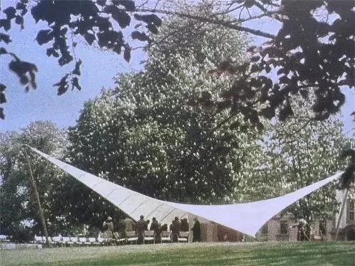 奧托1955年設(shè)計(jì)卡塞爾聯(lián)邦花園展覽音樂廳像是一個(gè)四點(diǎn)支撐的帳篷依靠邊索給膜施加預(yù)應(yīng)力使帳篷的外形呈現(xiàn)兩頭向上、兩頭向下的形狀(馬鞍形)這個(gè)設(shè)計(jì)宣告了帳篷設(shè)計(jì)進(jìn)入了全新的時(shí)代。