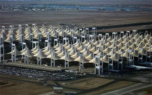沙特吉達(dá)國際機(jī)場的Hajj航站樓(朝覲航站樓)是全球穆斯林朝覲者前往麥加的重要交通樞紐,航站樓采用獨(dú)特的膜結(jié)構(gòu)帳篷屋頂,由特氟隆涂層玻璃纖維織物制成,可反射76%的太陽輻射,即使在高溫環(huán)境下也能保持室內(nèi)涼爽。是世界上最早也是最大的張拉膜結(jié)構(gòu)之一。由210頂巨大的錐形膜結(jié)構(gòu)單元組成,猶如一群沙漠中的帳篷,既體現(xiàn)了當(dāng)?shù)匚幕瘋鹘y(tǒng),又完美解決了大跨度遮陽問題。