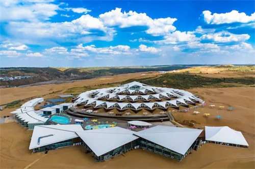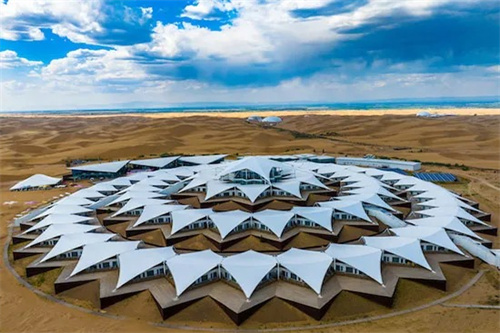 膜結(jié)構(gòu)以“蓮花”為靈感,通過層層張拉膜模擬蓮花的形態(tài),既呼應(yīng)沙漠中沙丘的曲線,又形成獨(dú)特的視覺景觀。這種設(shè)計(jì)不僅美觀,還充分考慮了沙漠環(huán)境中的日照、風(fēng)沙等因素,實(shí)現(xiàn)了功能與形式的統(tǒng)一。采用輕鋼結(jié)構(gòu)作為支撐,搭配高強(qiáng)度膜材,既減輕了建筑自重,又通過特定的鋼板固定流沙,形成類似“沙海浮舟”的獨(dú)特地基基礎(chǔ),確保在沙漠環(huán)境中保持穩(wěn)定。